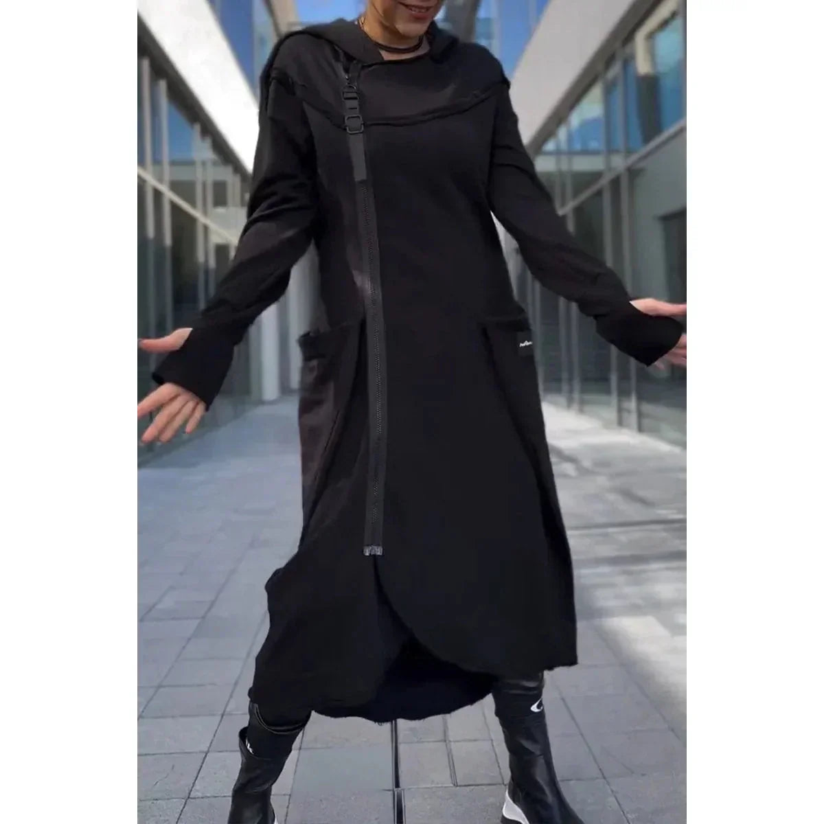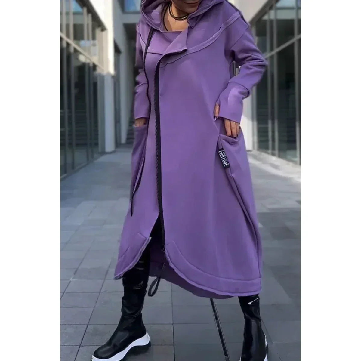 - Yksityiskohdat: Pitkät hihat, rento istuvuus, huppu