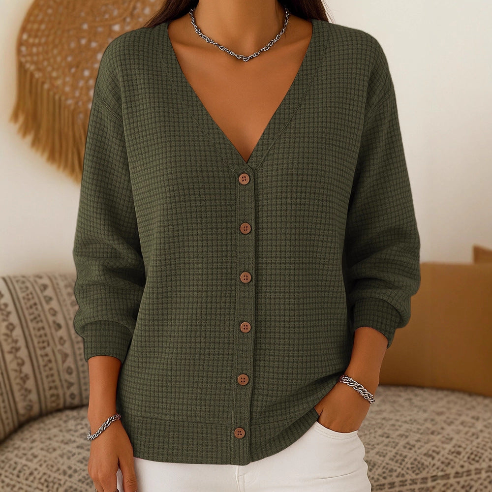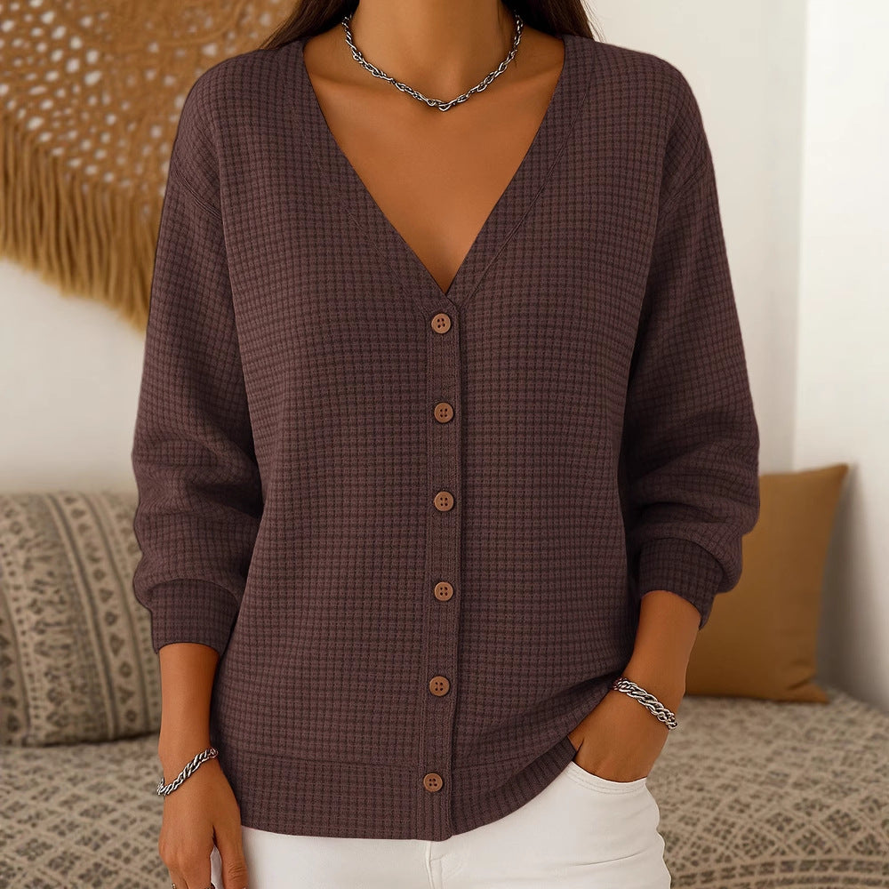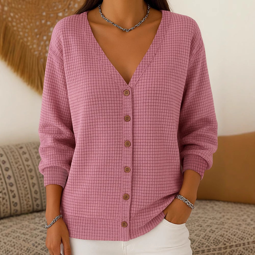- V-pääntie ja nappikiinnitys: Sinä saat naisellisen ja huolitellun ilmeen, joka keventää asua kauniisti ja toimii kerrospukeutumisessa.